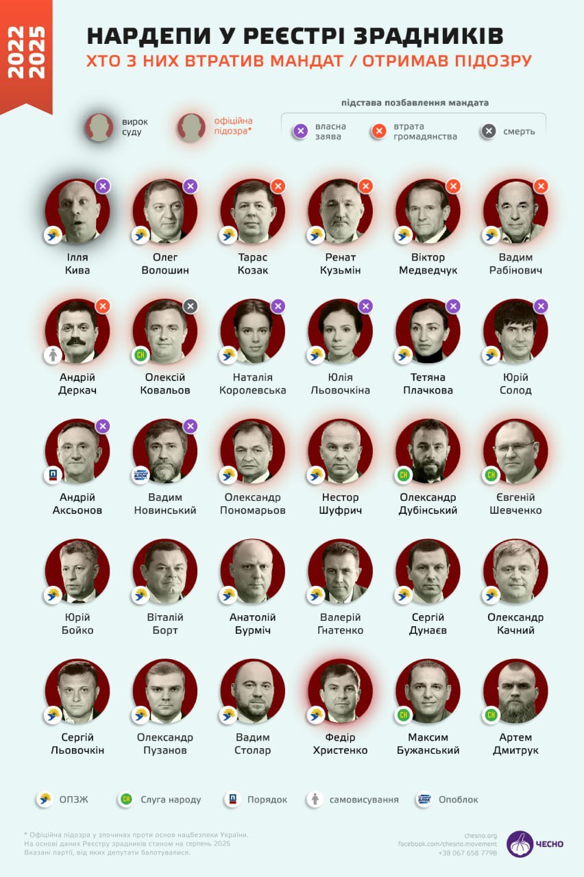 Рух ЧЕСНО аналізував, що найбільше нардепів-втікачів з колишньої фракції ОПЗЖ, позафракційних та екснардепів від “Слуги народу”. Частина цих депутатів має підозри в державній зраді. Також 15 народних депутатів поточного скликання отримали офіційні підозри в правопорушеннях проти національної безпеки.