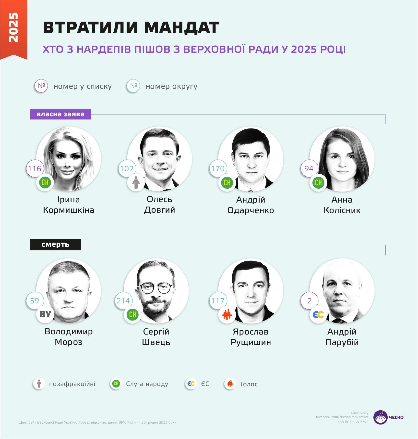 Верховна Рада також скоротилась через те, що у 2025 році пішли з життя аж четверо народних депутатів. Це мажоритарники Сергій Швець (“Слуга народу”), Володимир Мороз (від забороненої ОПЗЖ) та Ярослав Рущишин (“Голос”), а також другий номер у списку “Євросолідарності” та колишній спікер Ради Андрій Парубій, якого вбили в серпні у Львові.