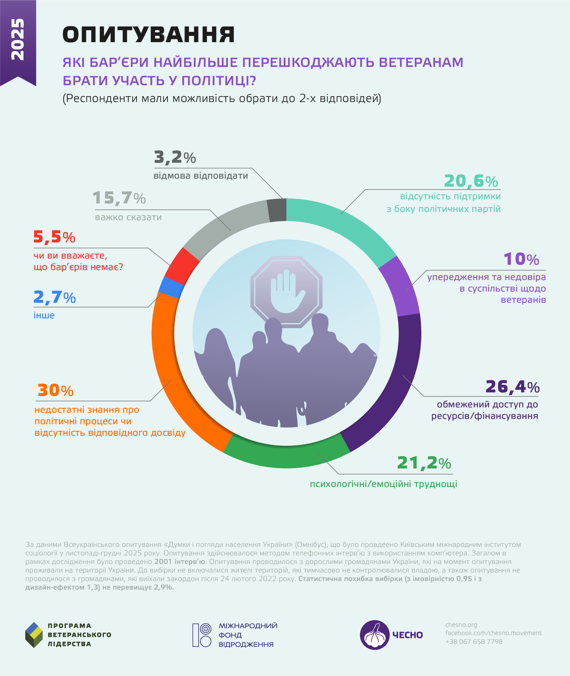 Дослідження також показало, що найбільшими перешкодами для політичної участі ветеранів вважаються недостатні знання про політичні процеси чи відсутність відповідного досвіду, обмежений доступ до ресурсів і фінансування, психологічні та емоційні труднощі, відсутність підтримки з боку політичних партій.