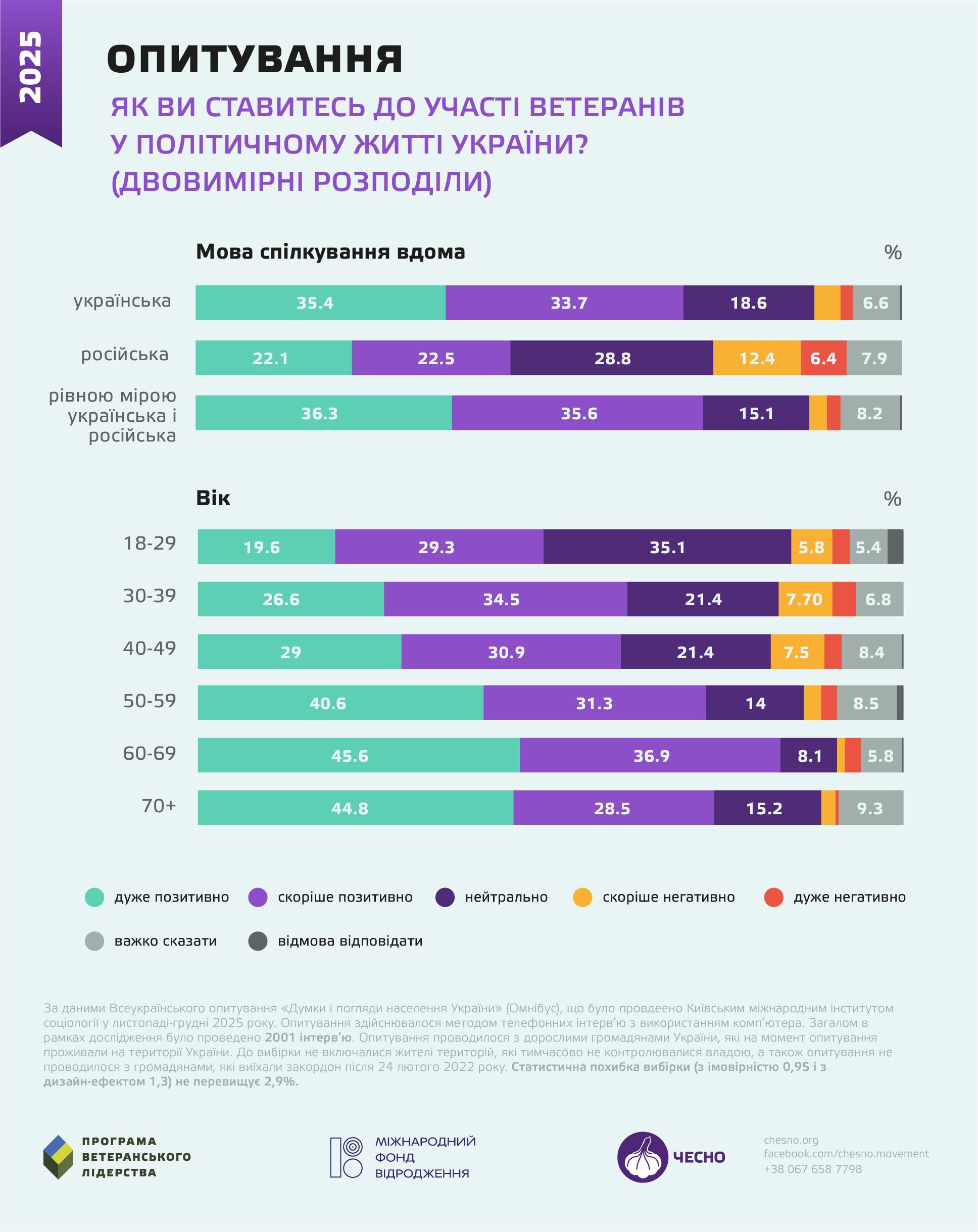 Зазначимо, у вересні 2024 року Рух ЧЕСНО проводив аналогічне дослідження. Показовим є те, що суспільна підтримка політичної участі ветеранів є доволі стабільною – на той час участь ветеранів у політиці та виборах підтримували 67,8%, а негативно ставилися 7,6% опитаних.