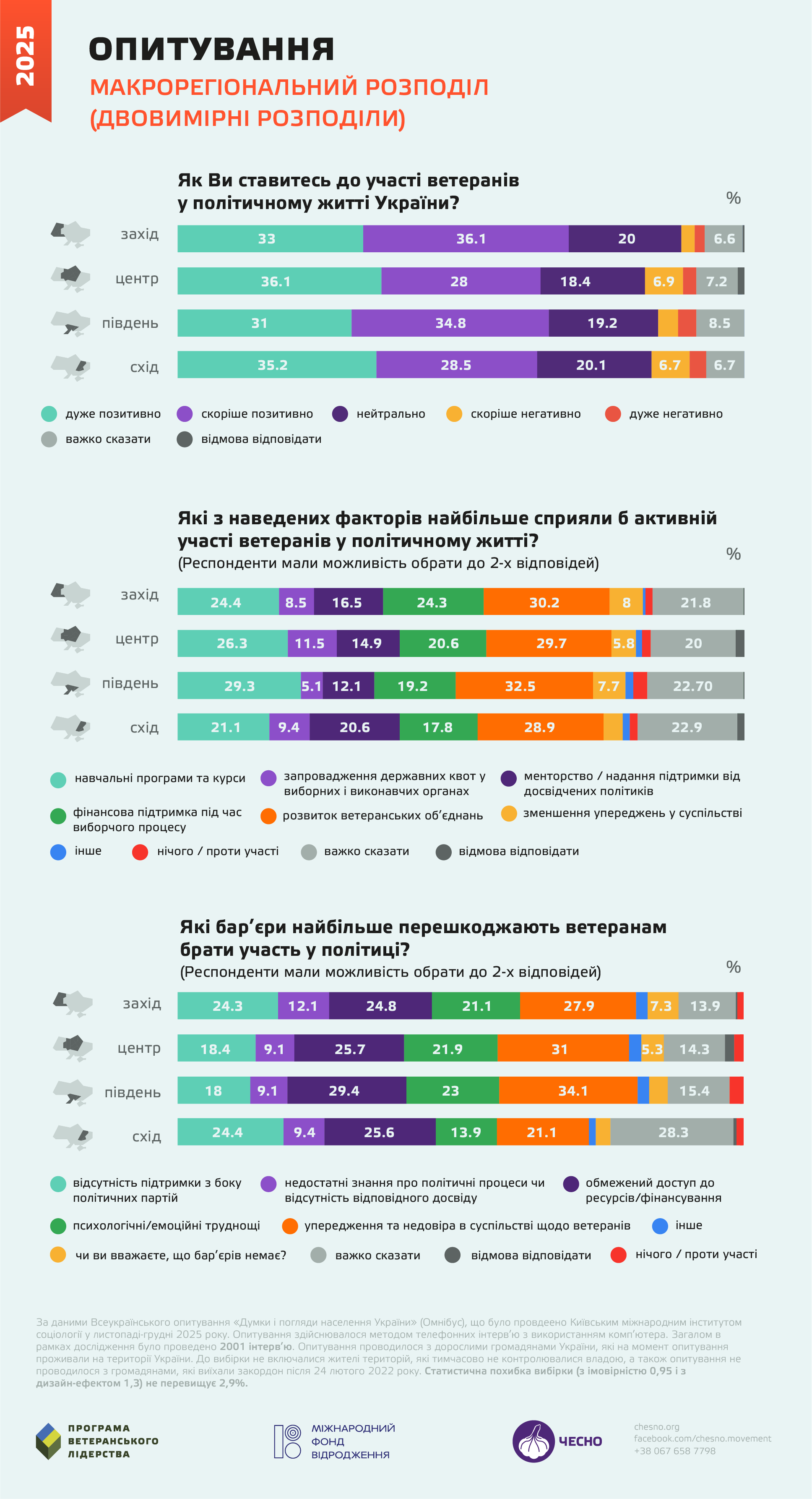 Регіональні відмінності не є суттєвими, проте вони існують. Так, 9% мешканців центральних і східних областей негативно ставляться до участі ветеранів у політичному житті, а на Заході цей показник є найменшим. Про потребу в доступності навчальних та освітніх програм і фінансову підтримку під час виборчого процесу частіше говорять на Півдні України. Крім того, мешканці Сходу вважають психологічні проблеми ветеранів і недостатні знання про політичні процеси чи відсутність відповідного досвіду меншою проблемою, ніж респонденти з інших областей.
