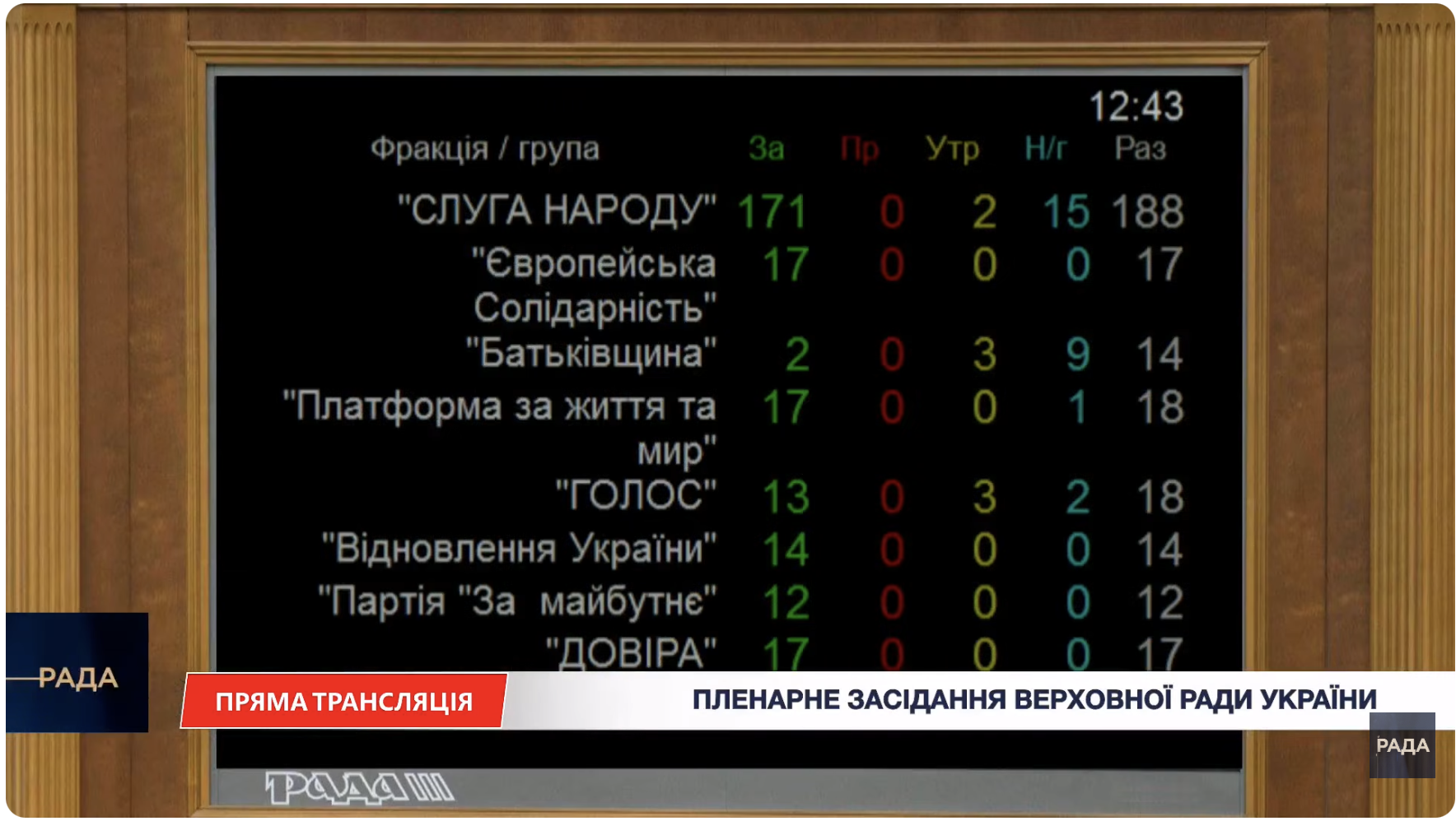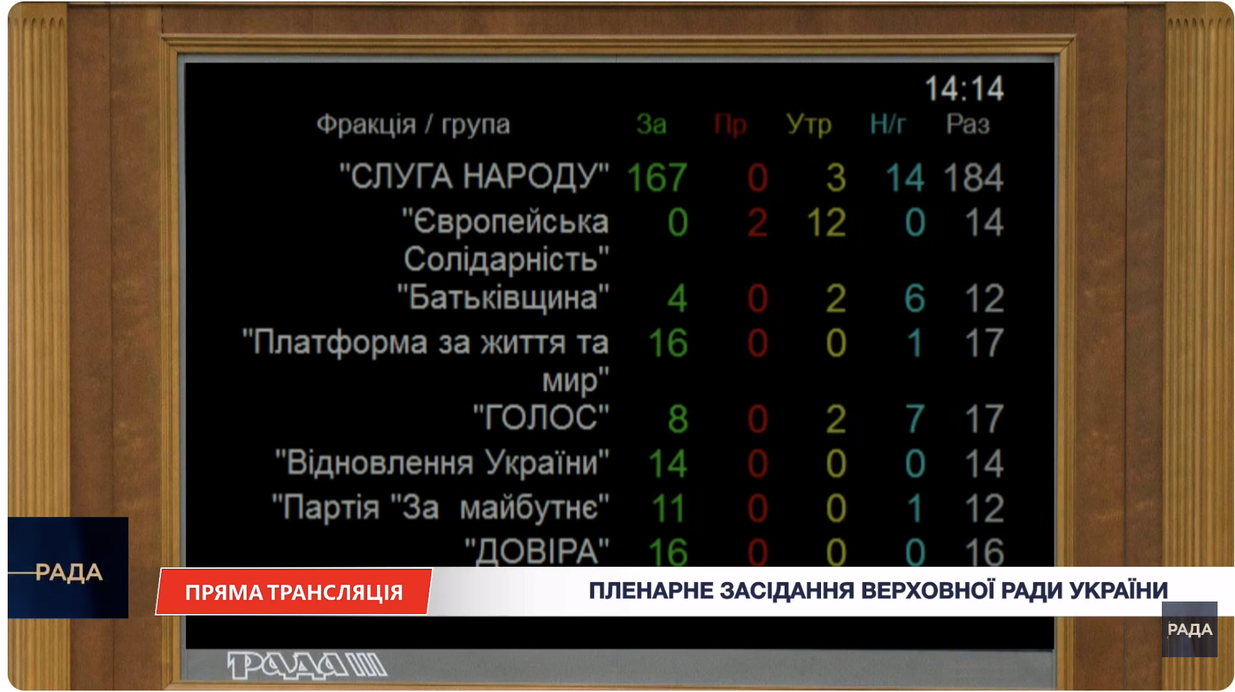 Фракція “Європейська солідарність” майже у повному складі утрималася. Двоє народних депутатів від цієї фракції (Олексій Гончаренко та Володимир Арʼєв) проголосували “проти”.