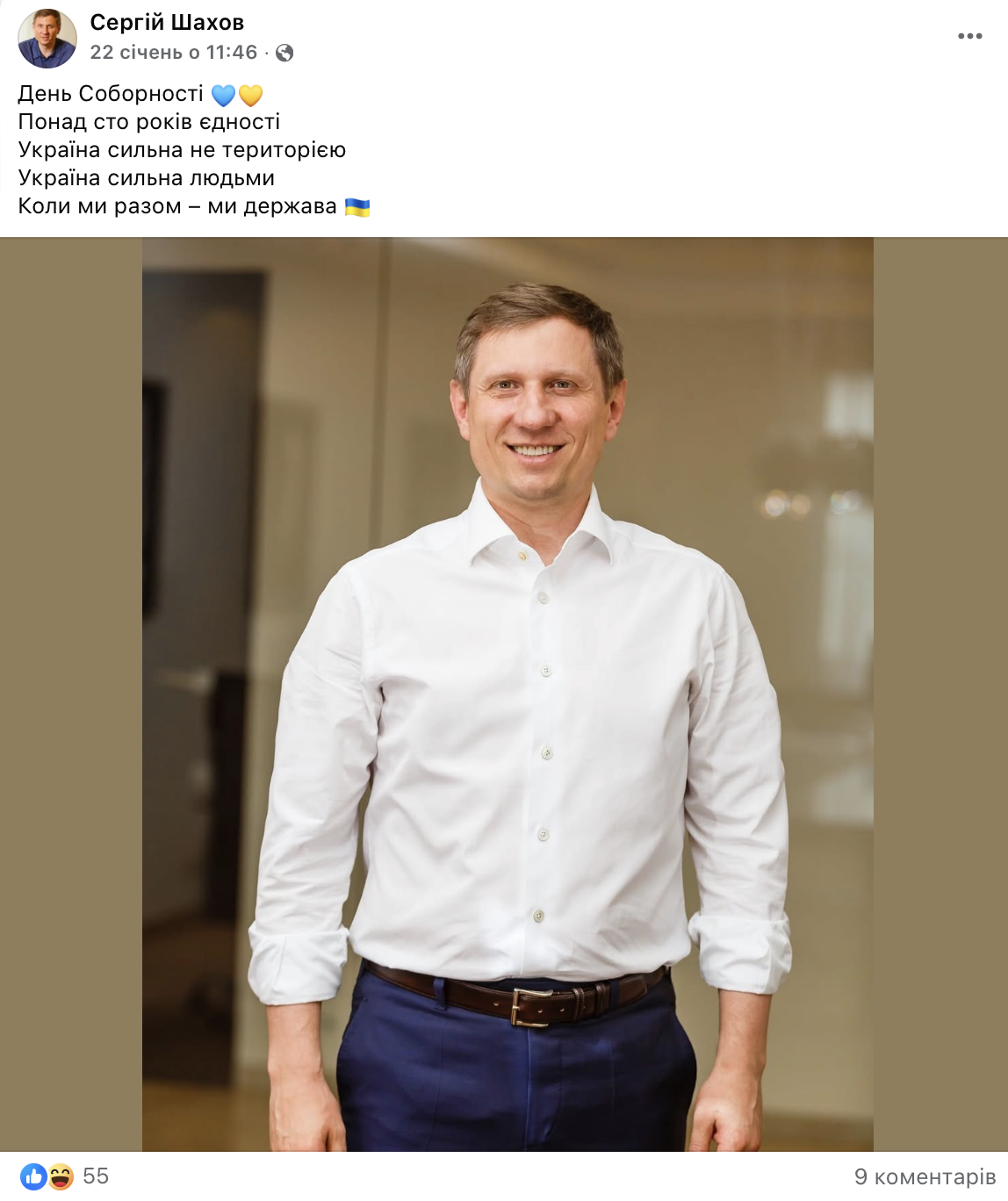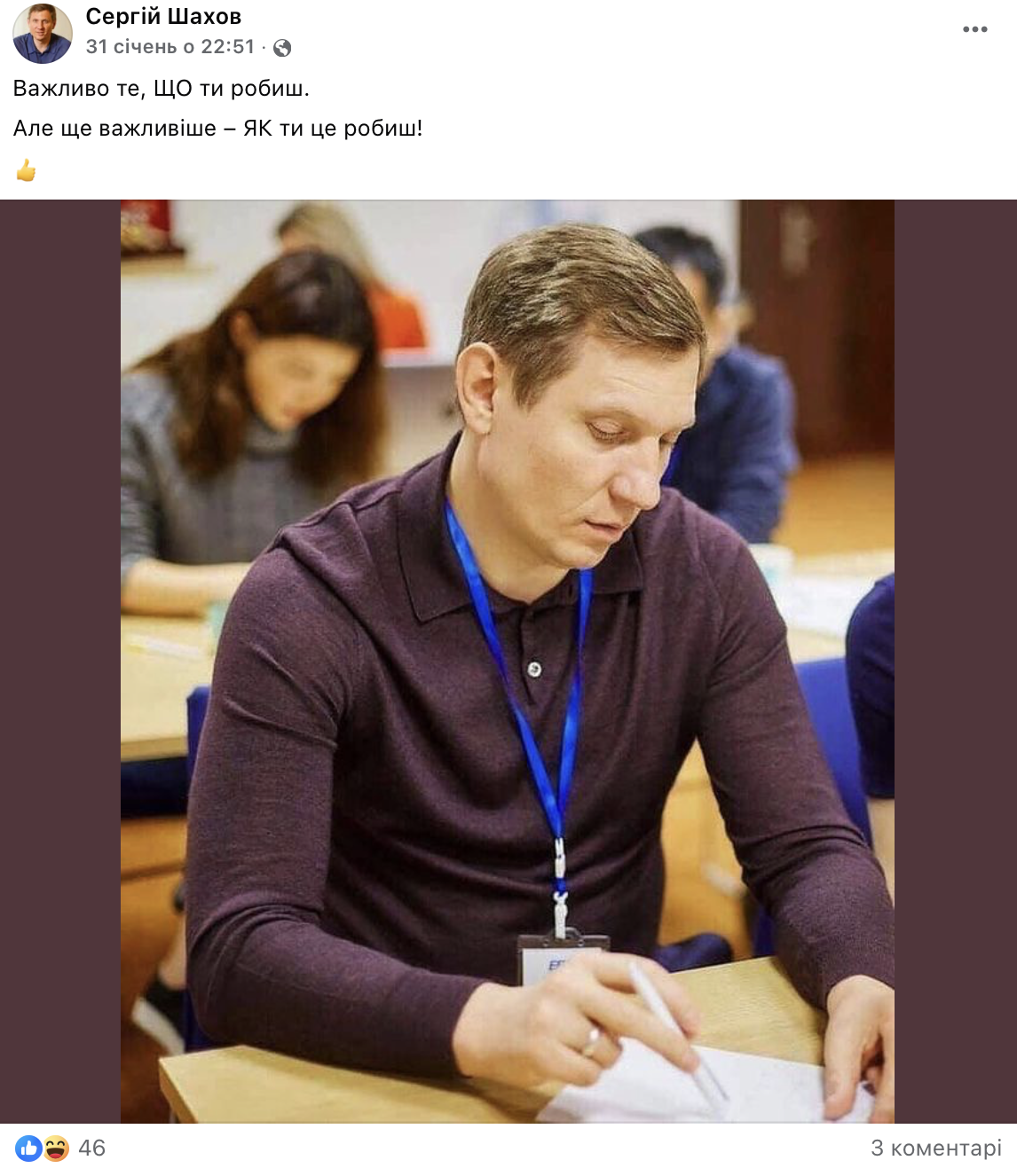 Шахов дуже активно веде свою сторінку у фейсбук і виставляє свої фото з різними надихаючими цитатами, побажаннями та привітаннями зі святами. Так, наприклад, 8 лютого цього року він написав “Як би зараз не було важко – все буде добре”.