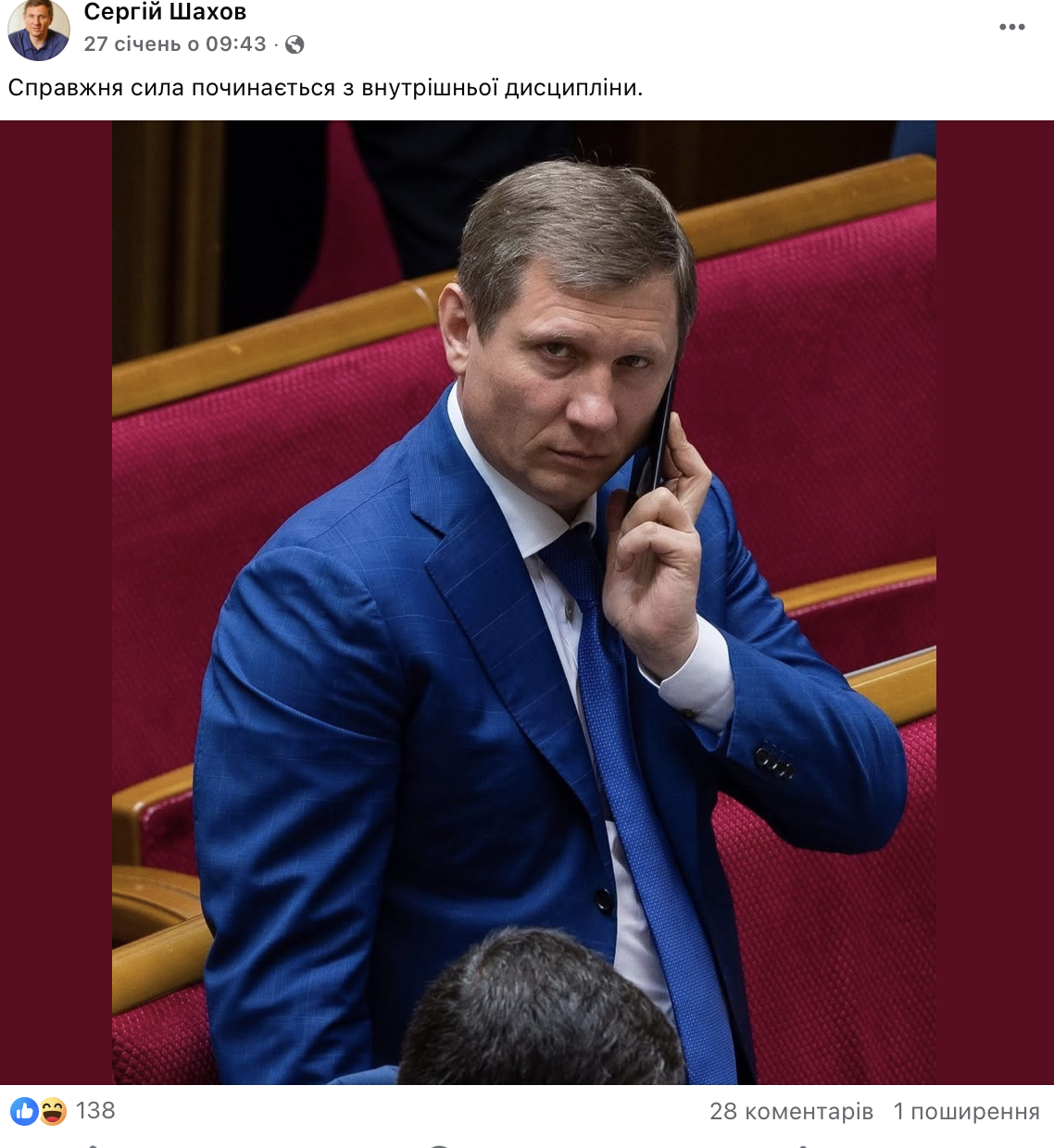 Часто на сторінці публікуються і фото нардепа з сесійної зали, що начебто демонструє його парламентську діяльність. Але це зовсім не так, адже Шахов пропустив 100% засідань Верховної Ради за увесь 2023, 2024 та 2025 роки і має 20,5% прогулів голосувань за 2022 рік.