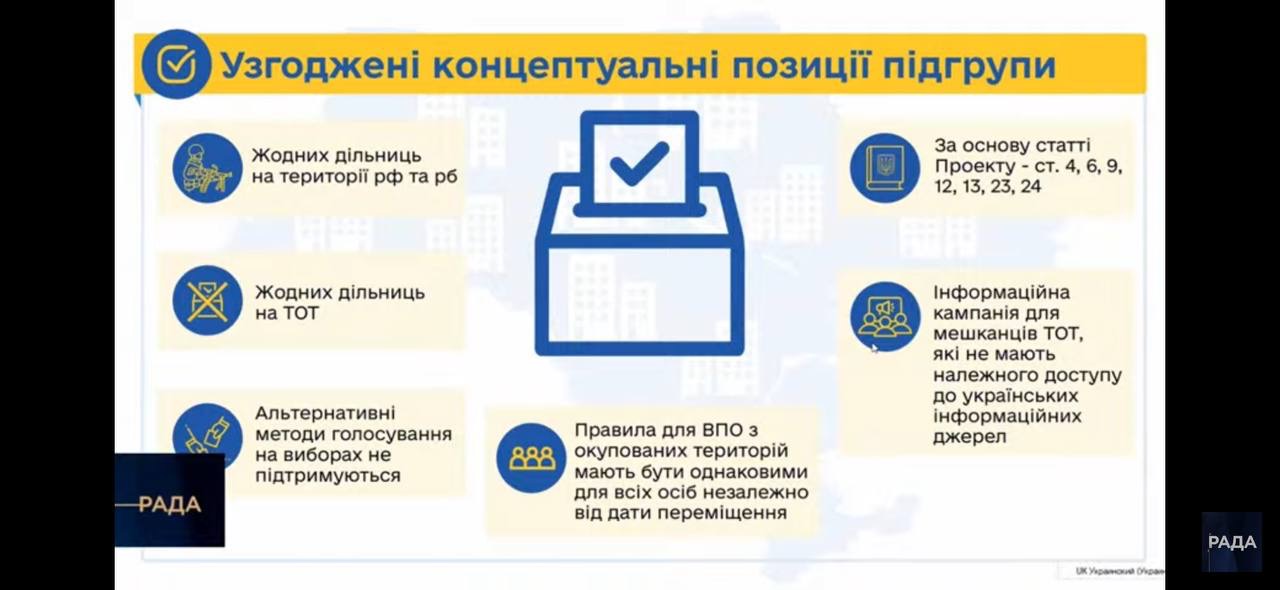 Альтернативних форм голосування на майбутніх повоєнних виборах не буде (зокрема онлайн), не передбачено й дільниць на окупованих територіях, а також у Білорусі та Росії. Натомість пропонується розширення переліку документів для голосування, поетапний механізм забезпечення участі ВПО у виборчому процесі та запровадження “фільтрів” для охочих бути обраними. Такі пропозиції щодо змін до виборчого законодавства презентувала парламентська профільна підгрупа з питань внутрішньо переміщених осіб (ВПО), тимчасово окупованих і прифронтових територій.