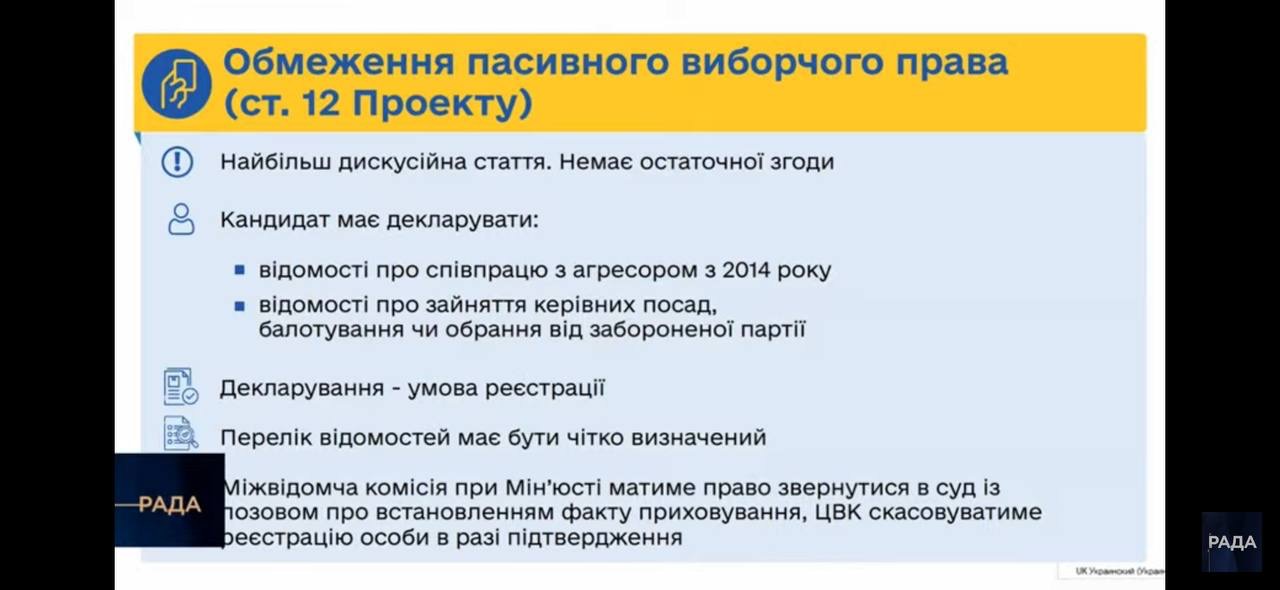 Окремо передбачено заборону на балотування для осіб з судимістю за умисні злочини та тих, хто має статус підозрюваного або обвинуваченого у вчиненні міжнародних злочинів. Наразі це найбільш суперечливі зміни, тому дискусії тривають і більше того, цій темі буде присвячено наступне засідання робочої групи.