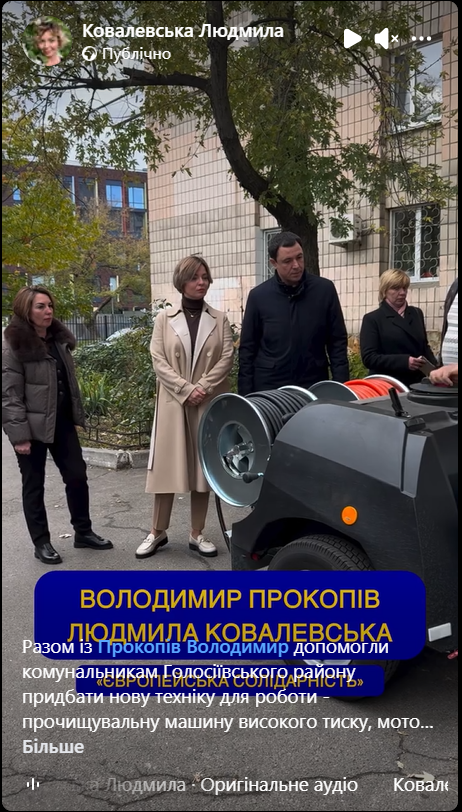 Так частину коштів депутатських фондів спрямовують на різноманітні ремонти й оновлення. Наприклад, представники “Європейської солідарності” Людмила Ковалевська та Володимир Прокопів “допомогли комунальникам Голосіївського району придбати нову техніку для роботи — прочищувальну машину високого тиску, мотокоси та бензопили”. А ще — кущоріз.