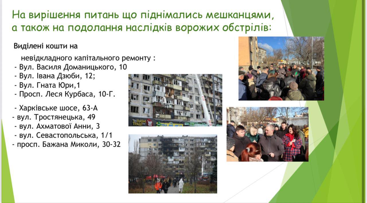 Його однофракційниця Ганна Старостенко відзвітувала про роботу на окрузі за 2025 рік. Переважно йдеться про використання коштів депутатського фонду, проте депутатка джерела фінансування не надто розділяє. Майже всі гроші спрямувала на матеріальну допомогу: 8,2 млн грн — 2367 цивільним особам, ще 6,6 млн грн — військовослужбовцям. З 15-ти млн залишилося 200 тис.. Утім, у переліку досягнень за рік депутатка зазначила довгий список: облаштування 32 пандусів у житлових будинках, безбар’єрний маршрут до ЦНАПу, розширення укриття у школі 264, встановлення вентиляційної системи в укритті 270-ої школи, світлофор на небезпечному переході (вул. Рейгана, 40 / вул. Пожарського), капітальний ремонт вул. Лаврухіна, модернізація бювету, а ще 700 тис. грн 120 мешканцям будинків, пошкоджених внаслідок обстрілів РФ.