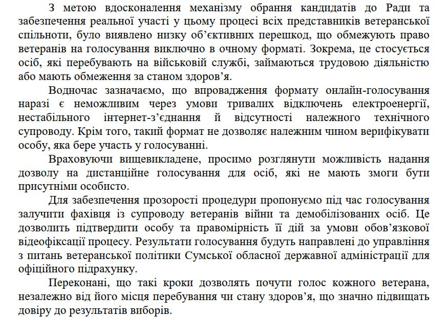 Зазначимо, що Сумська ОВА до проведення виборів зверталася до Міністерства у справах ветеранів щодо надання дозволу на дистанційне голосування. Адже це б дозволило учасникам, які за станом здоров'я та через інші обставини не можуть бути присутні особисто, все ж взяти участь у виборах.