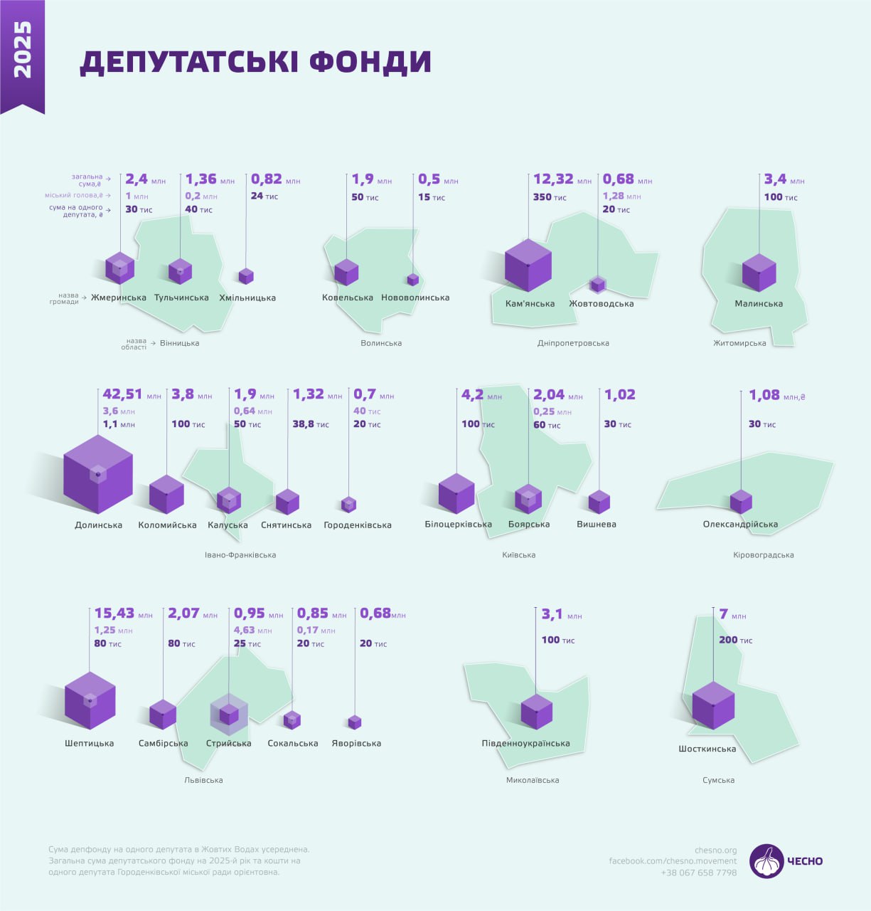 Зі ста найбільших за кількістю населення громад країни (крім обласних центрів) 24 мають депутатські фонди. Хоча б одне таке місто є в Миколаївській області — Південноукраїнськ, Житомирській — Малин, Кіровоградській — Олександрія та Сумській — Шостка.