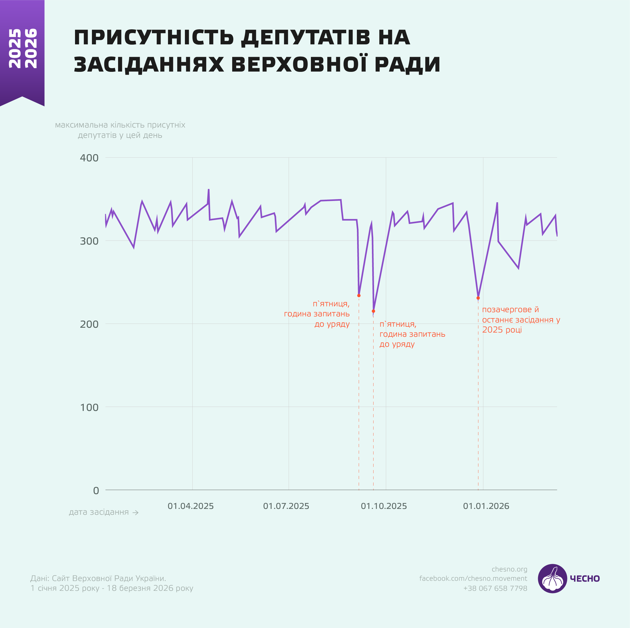 Утім, як показують дані голосувань, явка депутатів у 2026 році лишається такою ж стабільною, як і в попередньому 2025-му. Максимальна кількість зареєстрованих депутатських карток під час голосувань у Раді майже в будь-який день становила приблизно 310–320.