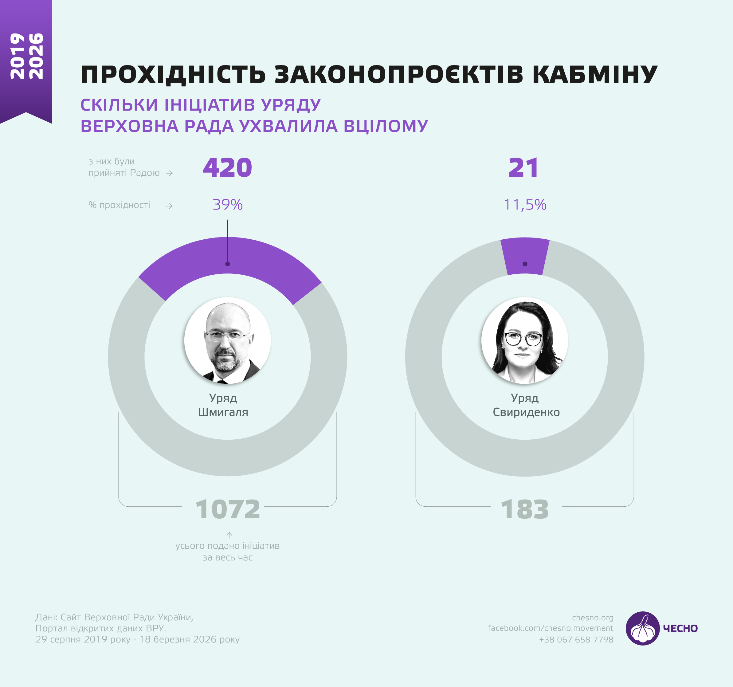 До того ж в уряду Свириденко набагато нижчий показник прохідності законопроєктів (тобто кількість проголосованих Радою ініціатив серед усіх зареєстрованих) — 11,5% проти 39% у Шмигаля.
