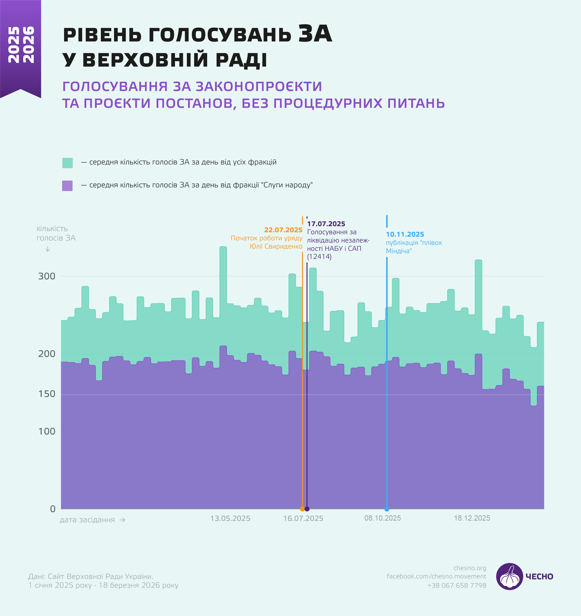 ЧЕСНО ще в жовтні писав, що “слугам” не вистачало в середньому 35 голосів для ухвалення рішень. Так, якщо на початку роботи ІХ скликання “слуги” давали в середньому 210–220 голосів “за”, то до осені 2025 року ця цифра впала до 186–195 голосів.