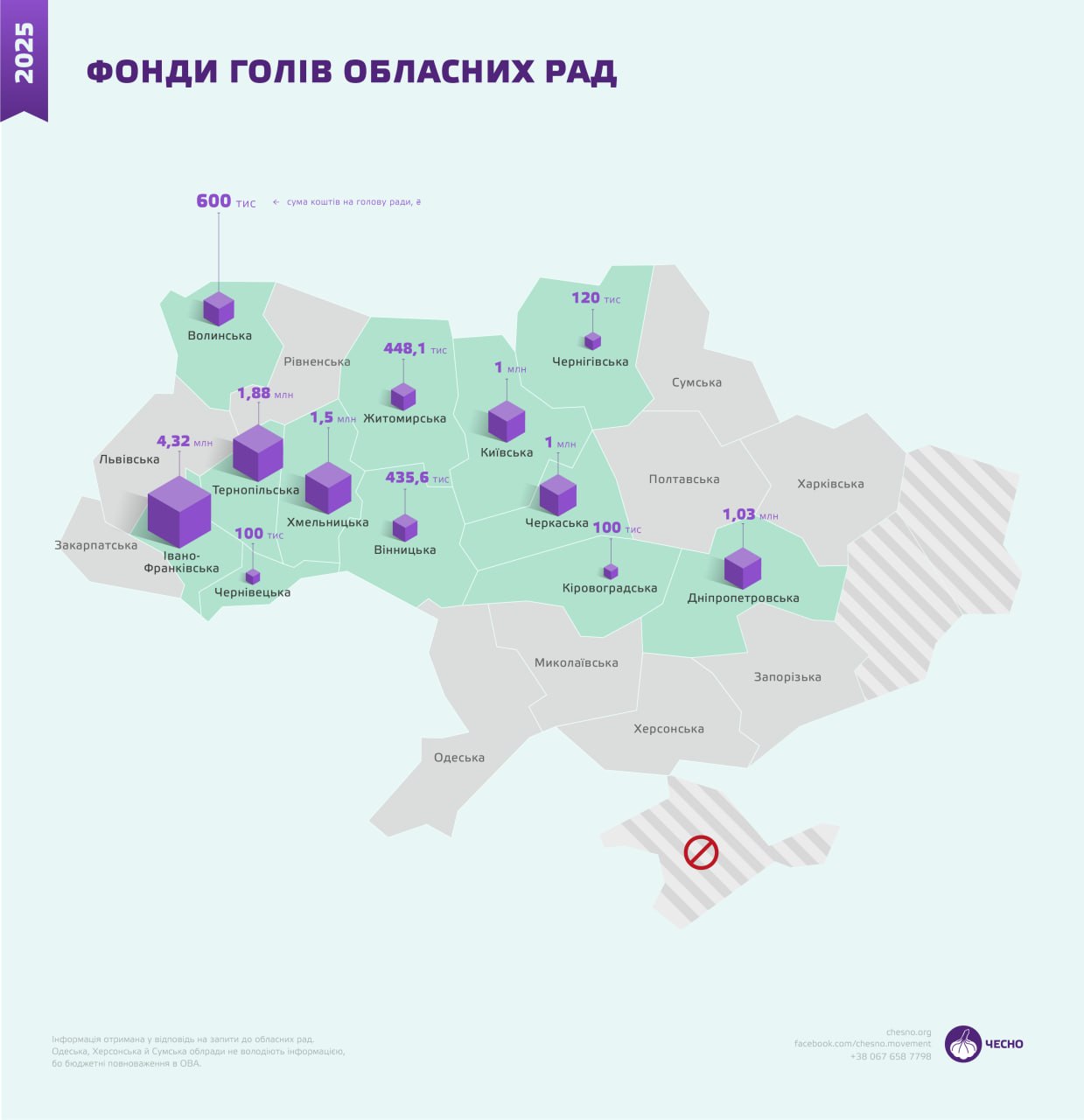 Найбільший дисбаланс зафіксовано в Хмельницькій області. Тут голова облради може розпоряджатися 30% усього фонду — близько 1,5 млн грн, тоді як кожен депутат — приблизно 50 тис. грн. Подібна ситуація і в Івано-Франківській області, де голова має понад 4 млн грн проти 150 тис. грн у депутата.