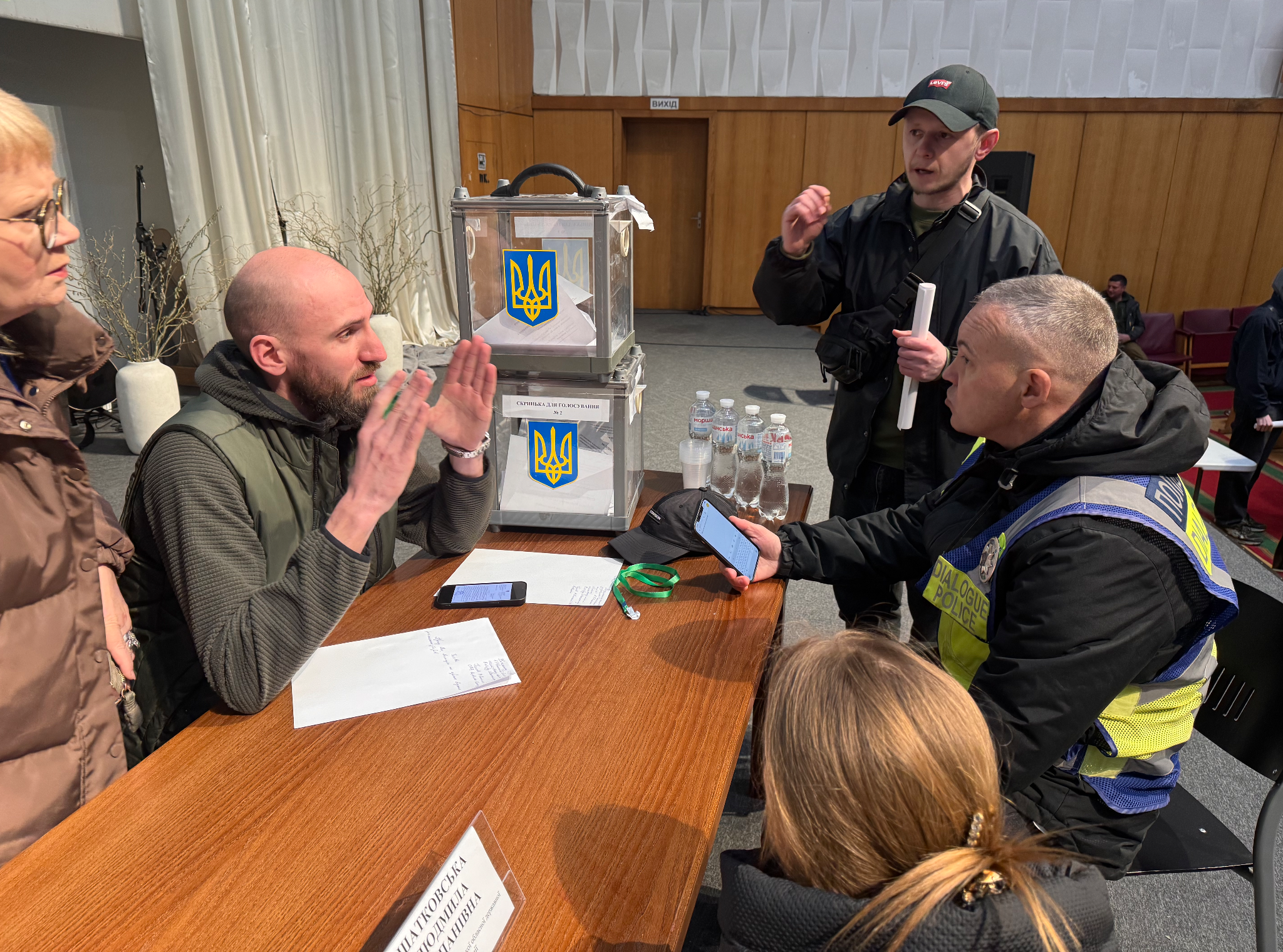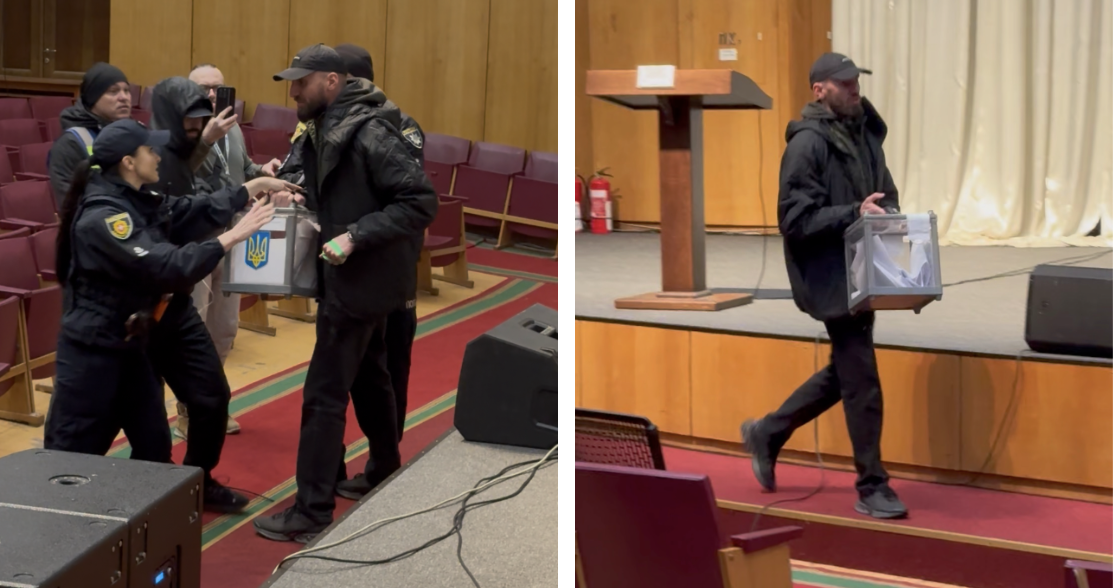 Представники поліції не дали можливості особам без статусу ветерана потрапити до зали. В цей же час Лазарчук вихопив дві скриньки, що знаходились у залі, та намагався зірвати пломби, аби визнати вибори недійсними. Зірвати пломби вдалося, проте скриньки не були пошкоджені або відкриті.