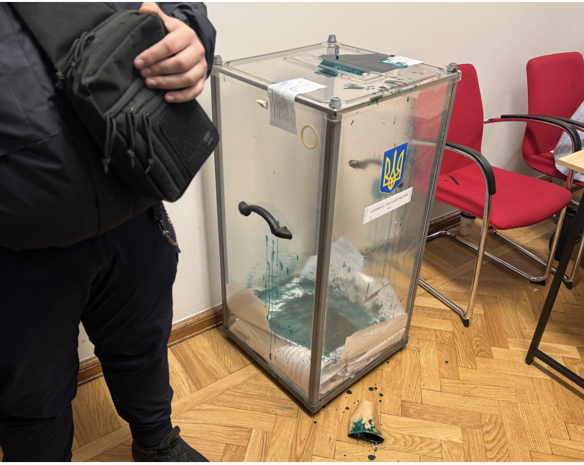 Зранку він намагався зірвати пломби з двох скриньок, а після втручання поліції заблокував доступ до них та президії. Згодом кандидат залив зеленкою скриньку для бюлетенів, яка була основною протягом дня голосування.