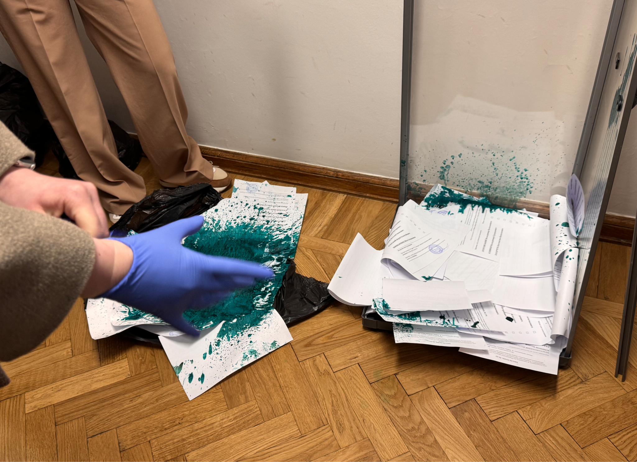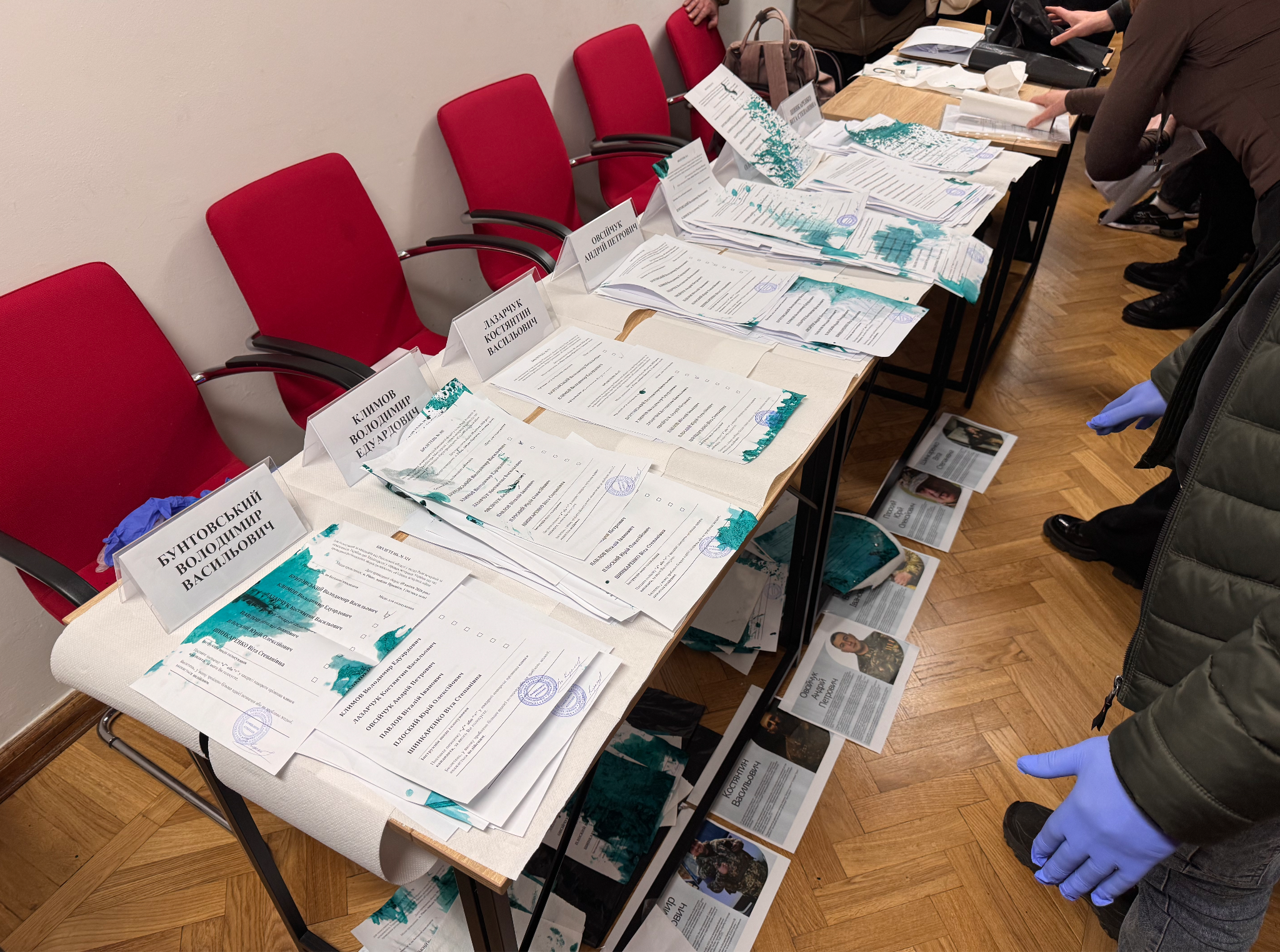 Після цього керівниця Управління з питань ветеранської політики ОВА та спостерігачі вирішили спробувати порахувати бюлетені в гумових рукавичках та з використанням доступних засобів.