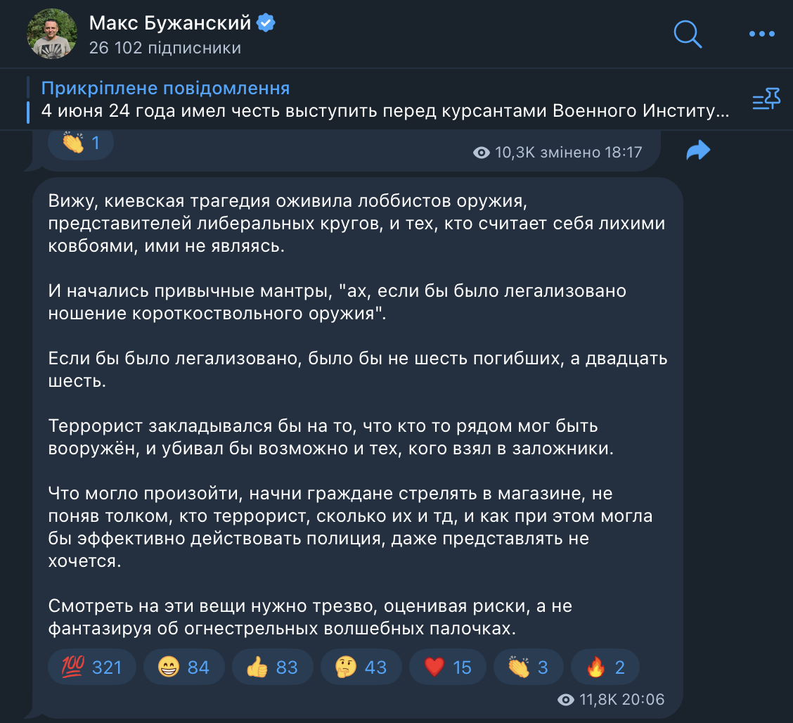 “Вважаю, що люди мають отримати право на збройний самозахист. Особливо після досвіду, коли на початку повномасштабного вторгнення цивільні люди отримували зброю для національного спротиву”.