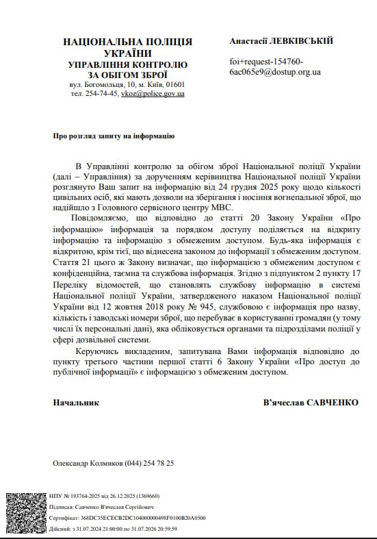 Водночас, аби розуміти кількість цивільних українців, які мають дозвіл на зберігання та носіння вогнепальної зброї, ми звернулись із запитом до Національної поліції України. Проте керівник Управління контролю за обігом зброї Нацполу В'ячеслав Савченко відмовив у наданні інформації, бо вона службова та має обмежений доступ.