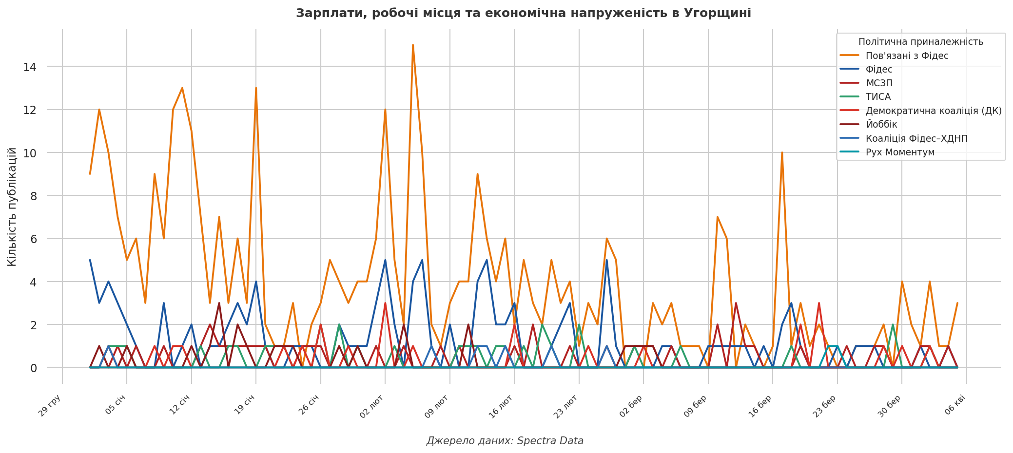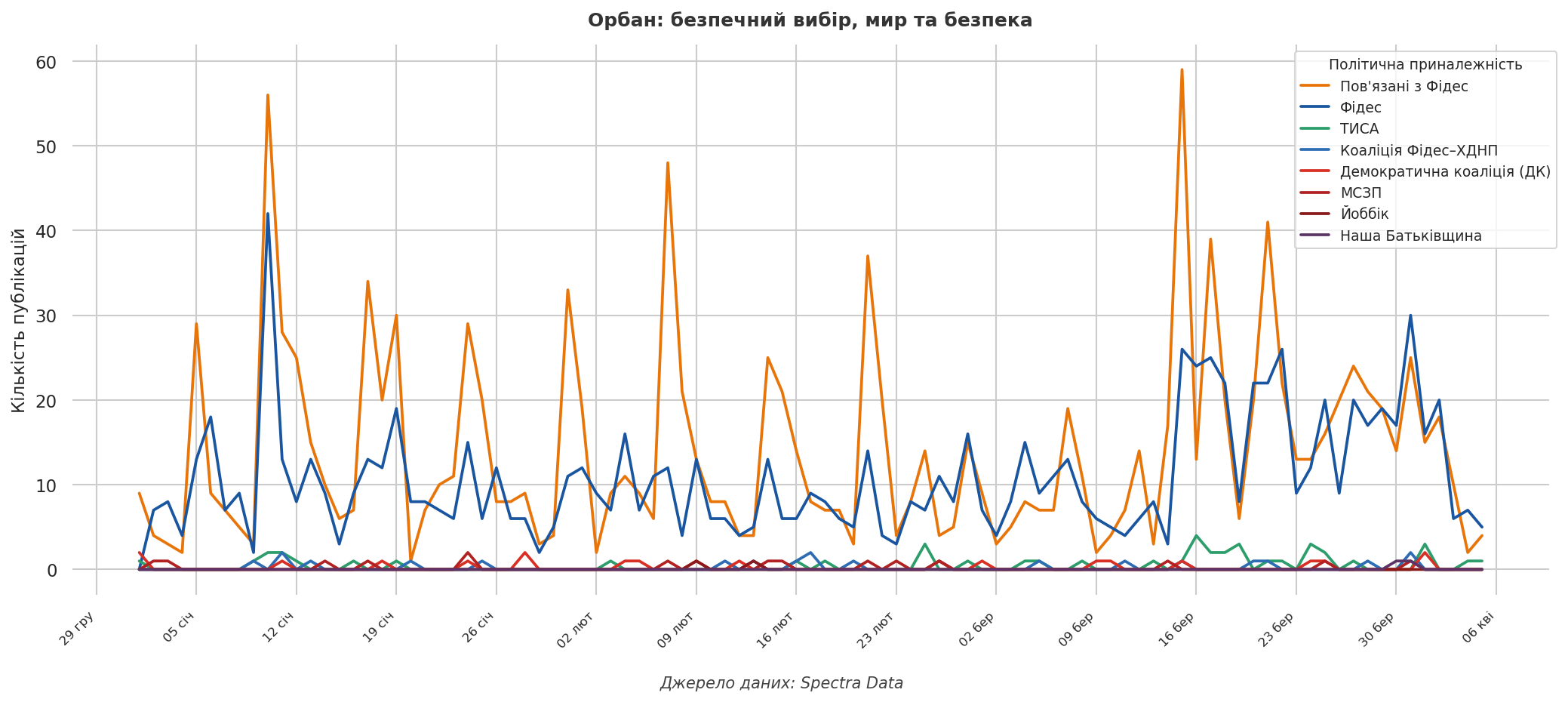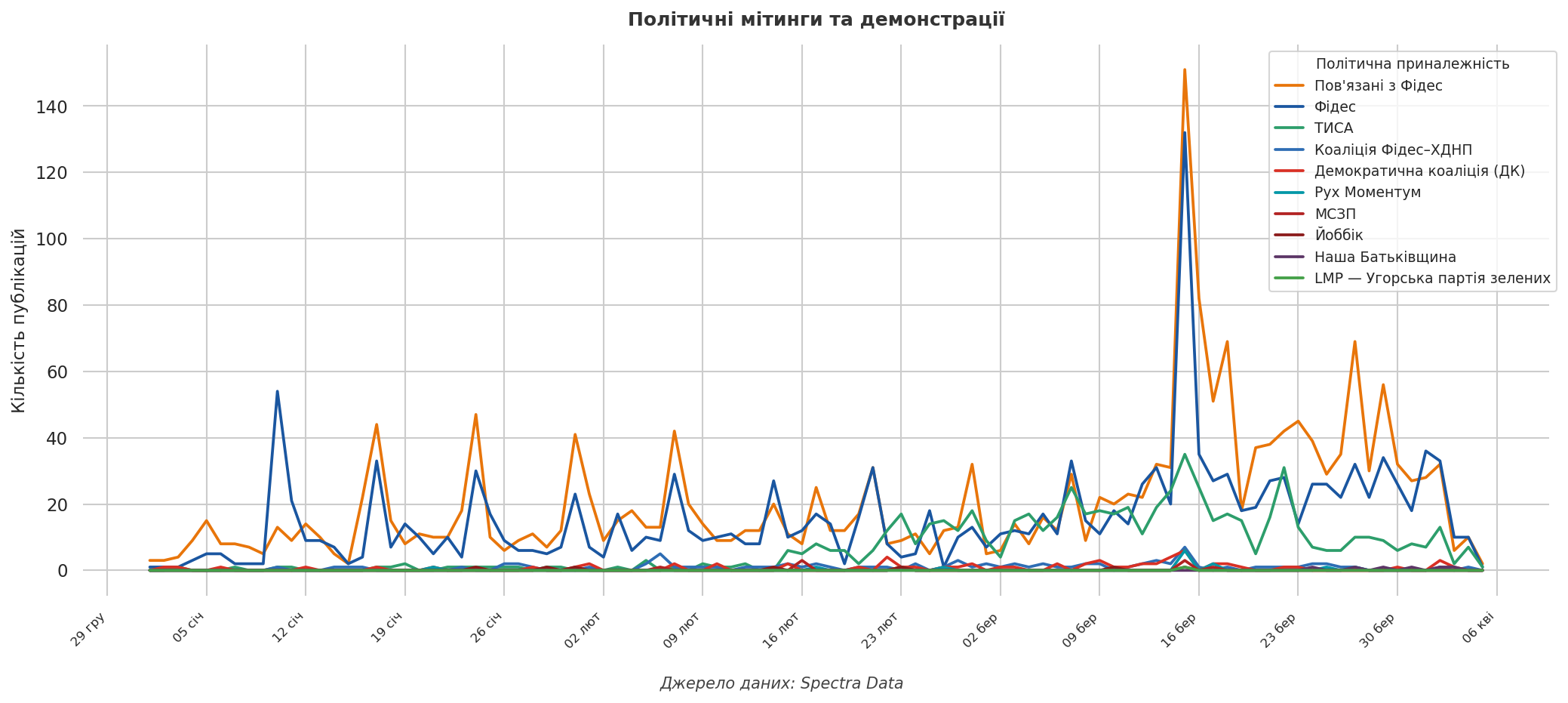 Методологія: Аналіз ґрунтується на масиві 138 800 публікацій у Facebook, зібраних із 72 угорських сторінок за період з 1 січня по 6 квітня 2026 року — включно з акаунтами новинних видань, політичних партій, громадських організацій та окремих публічних осіб. Для виявлення тематичних груп контенту було використано метод кластеризації на основі алгоритмів машинного навчання із застосуванням мовних моделей. У результаті виділено 50 тематичних кластерів. Політичну належність сторінок визначено методом ручної розмітки на основі відкритих джерел. Дані були надані Spectra Data.