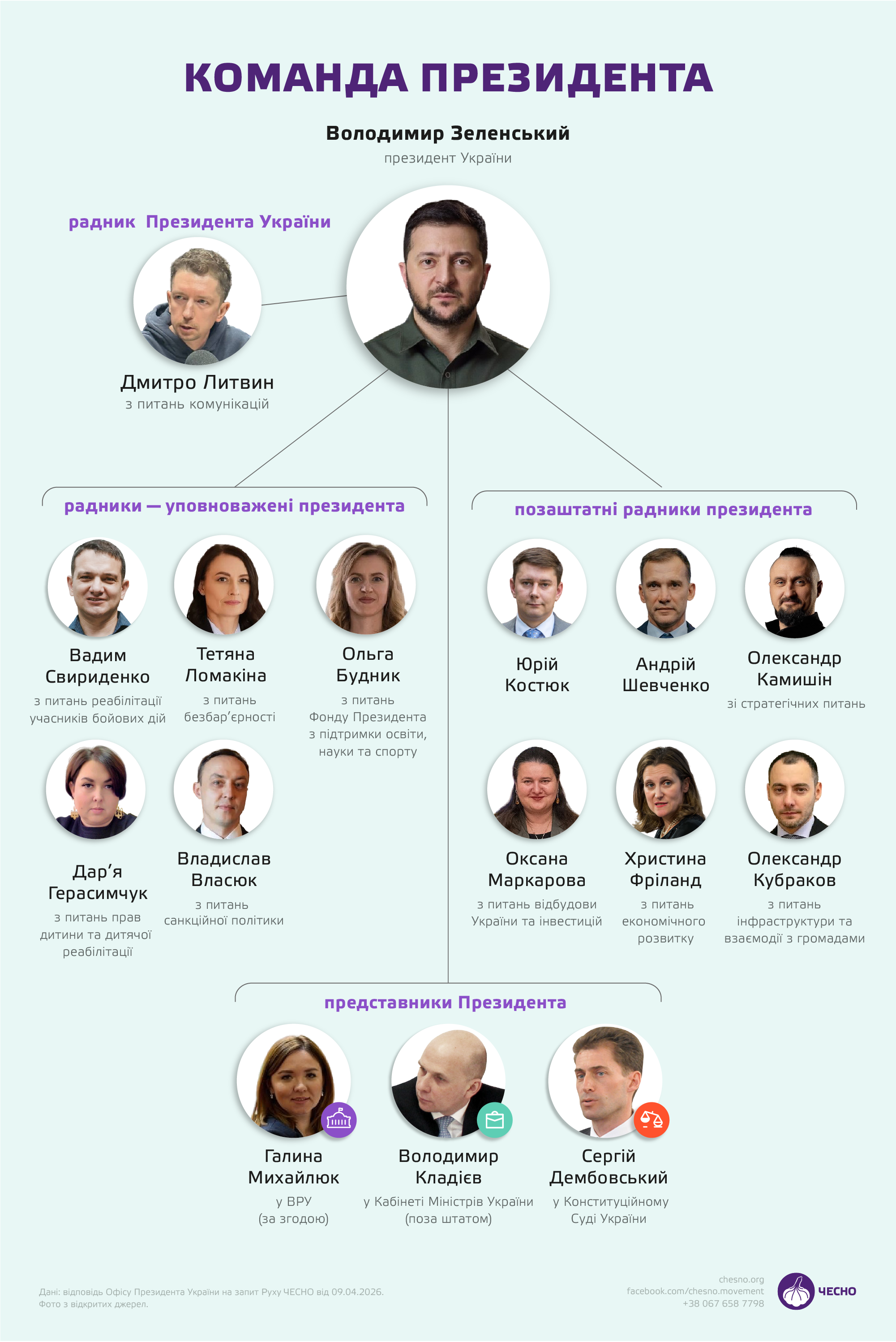 Згідно з відповіддю на наш інформаційний запит, станом на сьогодні безпосередньо в команді Володимира Зеленського працюють 15 осіб: один штатний радник, шестеро — позаштатних, п'ятеро радників-уповноважених та троє представників президента в державних органах.