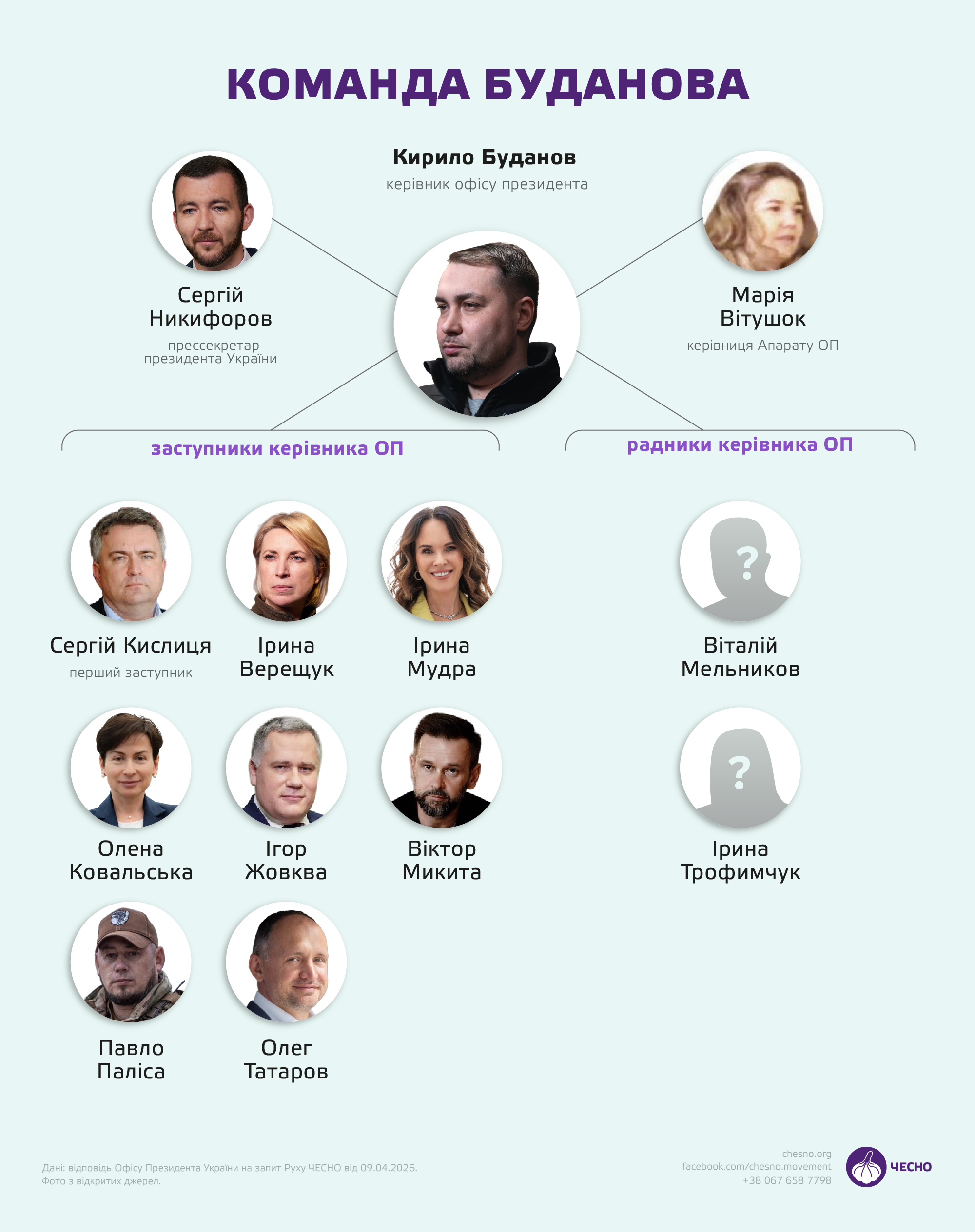 Команда Кирила Буданова в Офісі президента налічує щонайменше 12 осіб: вісьмох заступників керівника ОП, двох штатних радників, прессекретаря президента Сергія Никифорова та керівницю апарату ОП Марію Вітушок.